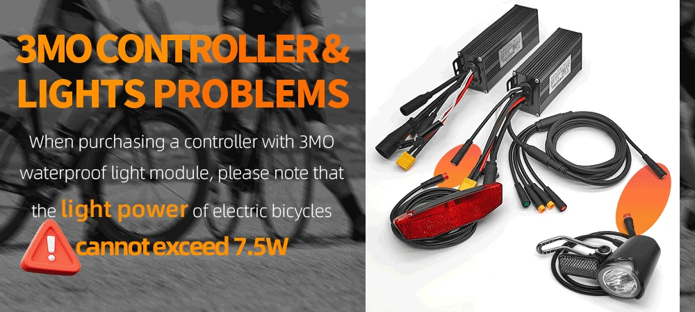 Quando acquisti un controller con modulo luce con spina impermeabile 17A-30A 3MO, controlla che la potenza luminosa della bicicletta elettrica acquistata non possa superare 7,5 W, altrimenti il modulo luce con spina impermeabile 17A-30A3MO non potrร essere utilizzato!!!