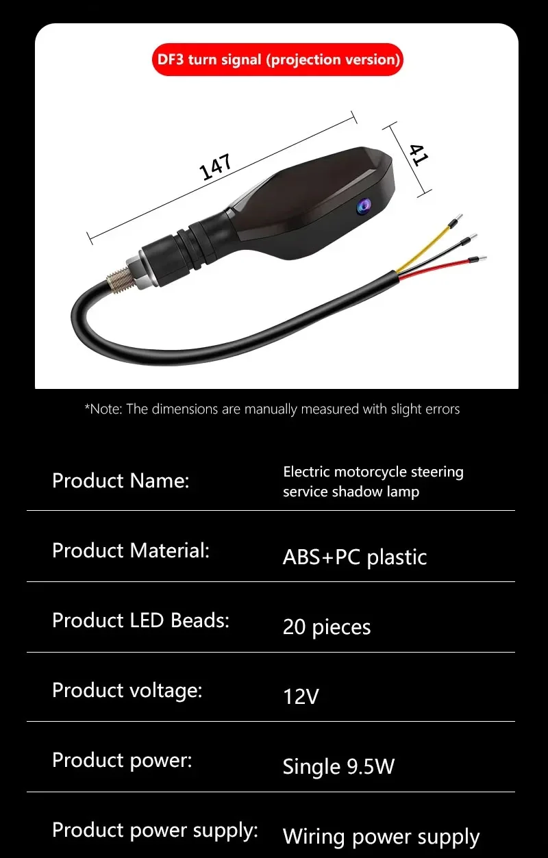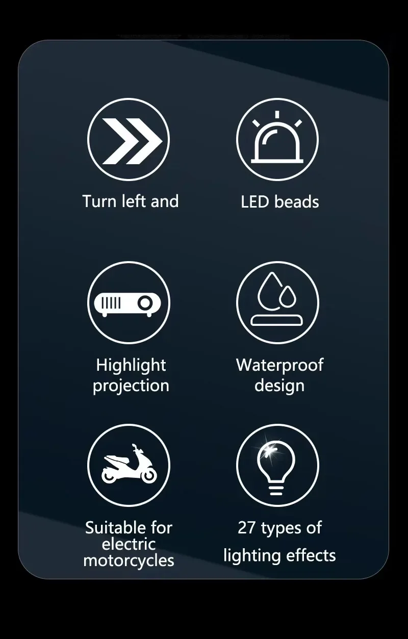 Questo indicatore di direzione per proiezione di moto utilizza una sorgente luminosa a LED ad alta luminosità, che ha una forte penetrazione della luce ed effetti visivi e può fornire una buona illuminazione e avviso di notte o in caso di maltempo.